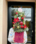 Doğal çam dallarının taze dokusu; kırmızı kokinalar, altın yılbaşı süsleri, mini kozalaklar ve burgundy poinsettia detaylarıyla harmanlanarak zengin bir kış kompozisyonu oluşturur.