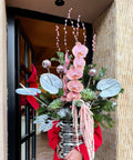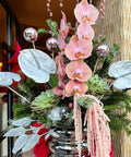 İçerik: Pembe orkide dalı, gümüş anthurium, yılbaşı yeşillikleri, sukulentler, soft pembe amarantus, gümüş kuru başak detayları.