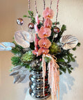 Işıltılı yılbaşı ruhunu modern bir zarafetle birleştiren Frosted Blush, pembe orkidenin romantik dokunuşu, gümüş anthuriumların buzlu parıltısı ve yılbaşı yeşillerinin taze enerjisiyle kusursuz bir bütünlük sunar. Gümüş detaylı premium vazo yükselen heykelsi formu daha da vurgular.