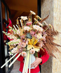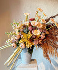 İçerik: Gerbera, gül, orkide, şakayık benzeri mevsim çiçekleri, altın yaprak detayları, kuru lotus, pampas, ekinyos, dekoratif bambu çubuklar, doğal yeşillikler.