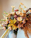 Doğanın sıcak tonlarını çağdaş bir estetikle buluşturan Golden Meadow, altın yaprak detayları, kuru ve taze çiçeklerin dengeli birlikteliği ve heykelsi siluetiyle dikkat çeken özel bir Amavi Flowers tasarımıdır. Rustik zarafet ve modern lüksü aynı anda hissettiren bu aranjman, mekâna anında sanatsal bir atmosfer katar.