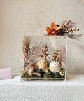 Şeffaf pleksi kutu içinde yer alan ışıltılı geyik figürü; altın süslemeler, dokulu yılbaşı objeleri ve doğal yosun zeminiyle birleşerek derinlikli bir kış sahnesi oluşturur.
