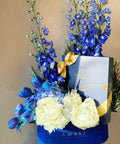 İçerik: Delphinium, galaksi lale, beyaz şakayık, lavanta detayları, premium Godiva çikolata kutusu, kadife Amavi hediye kutusu.