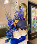 Derin lacivert tonlarının ihtişamını, çiçek sanatının modern çizgileriyle buluşturan Midnight Blue Gift Box; hem şık hem de etkileyici bir hediye deneyimi sunar. Godiva’nın seçkin çikolataları ile özel olarak renklendirilmiş galaksi laleler, zarif delphiniumlar ve beyaz şakayıklar bir araya gelerek güçlü, rafine ve unutulmaz bir kompozisyon oluşturur. Kadife dokulu Amavi hediye kutusu, tasarımın bütünlüğünü lüks bir dokunuşla tamamlar.