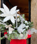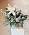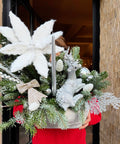 İçerik: Kar efektli çam dalları, beyaz pelüş çiçek, simli geyik figürü, gümüş çubuk mum, gümüş kozalaklar, beyaz ve gümüş dekoratif dallar.