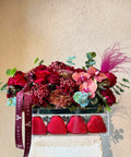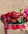Yoğun kırmızı güllerin derinliği; orkide, krizantem ve özel dokulu çiçeklerle tamamlanarak güçlü, romantik ve unutulmaz bir etki yaratır.