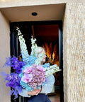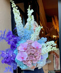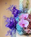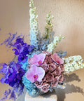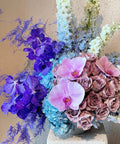 Vanda orkide, phalaenopsis orkide, gül, ortanca ve delphiniumun etkileyici uyumuyla hazırlanmıştır.