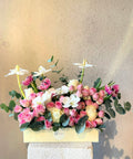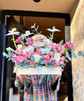 Pastel tonların yumuşak geçişleri ve pleksi kutunun modern duruşu, bu aranjmanı hem duygusal hem şık bir hediye haline getirir.