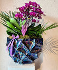 Derin mor tonlarının modern bir ışıltıyla buluştuğu Amavi’s Violet Aura, zarafeti ve sofistike gücü aynı kompozisyonda bir araya getirir. Işığı yansıtan özel dokulu seramik vazo içinde konumlanan mor phalaenopsis orkide, tropikal yeşilliklerle dengelenerek heykelsi ve etkileyici bir form kazanır. İlk bakışta dikkat çeken bu tasarım, bulunduğu mekâna güçlü ama rafine bir atmosfer katar.