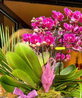 İçerik: Mor midi multi dal orkide, tropikal yeşillikler, dekoratif kuru ve mevsimsel detaylar