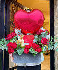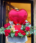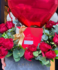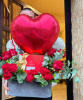 Kırmızı güller, okaliptus ve dekoratif yeşillikler, kalp formunda balon, Godiva premium çikolata kutusu, Amavi özel tasarım lüks kutu.
