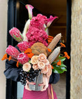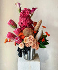 Canlı çiçeklerle mevsim meyvesinin buluştuğu bu özel aranjman, hem görsel bir şölen hem de şıklığın bir yansıması. Sonbahar davetleri, teşekkür hediyeleri ya da dekoratif kullanım için ideal bir seçim.