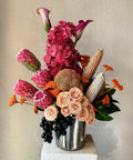 Aura Aranjmanı, mevsimin en etkileyici tonlarını ve dokularını bir araya getirerek zarif ve dikkat çekici bir kompozisyon sunuyor. Egzotik protea çiçeğiyle başlayan bu uyum, romantik güller, dolgun ortancalar, zarif gala çiçekleri ve doğallığın sembolü üzüm ile tamamlanıyor.