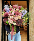 Her biri özenle seçilmiş krizantem, gül, orkide, ortanca ve delphinium çiçekleriyle zenginleştirilen bu tasarım; dokusal derinliği, yumuşak renk geçişleri ve zarif formuyla dikkat çeker.
