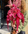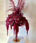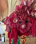 Cymbidium orkide, bordo krizantem, amaranthus, dekoratif pampas ve mevsim çiçekleri.