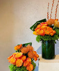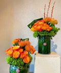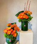 Yeşil cam vazolar içerisinde turuncu güller, lucaspermium,erengül ve dekoratif yeşillikler modern bir mimari anlayışla bir araya getirilmiştir. Dikey ve yuvarlak formların birlikte kullanıldığı bu kompozisyon; davetler, iş yerleri, otel lobileri ve kurumsal alanlar için etkileyici ve profesyonel bir atmosfer sunar.
