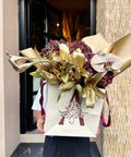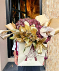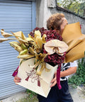 Amavi logolu özel çantada sunulan bu tasarımda; altın lilyumlar, metalik orkide, bordo ortanca ve mevsimsel yeşillikler yer alır.