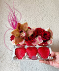 Amavi Flowers’ın sanatsal bakış açısıyla tasarlanan bu özel pleksi kutu aranjmanı, alt bölümünde yer alan kalp formundaki premium çikolatalarla birlikte duygusal olduğu kadar görsel olarak da etkileyici bir hediye deneyimi yaratır. Özel anlarda zarif ama iddialı bir iz bırakmak isteyenler için tasarlanmıştır.