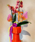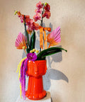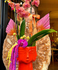 Solar Muse, canlı renklerin sanatsal bir dengeyle buluştuğu, enerjik ve modern bir Amavi Flowers tasarımıdır. Turuncu seramik yüz vazonun heykelsi formu; pembe, mercan ve mor tonlardaki orkide çiçekleriyle birlikte güçlü bir görsel ifade yaratır. Cesur renk kontrastları sayesinde bulunduğu mekânda anında dikkat çeker.