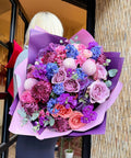 İçerik: Lila gül, krizantem, ponpon anastasya, sümbül, lisyantus, şebboy,ortanca okaliptus, mevsimsel mor–pembe karışık çiçekler.