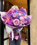 Pastel romantizmi ile morun enerjisini buluşturan Lavender Whimsy, büyüleyici renk geçişleriyle zengin ve dolgun bir görsel şölen sunar. Lila güller, mor krizantemler, pembe ponpon çiçekler ve mis kokulu sümbüller, bukete hem zarafet hem de canlılık katar. Modern ve romantik çizgilerin dengelendiği bu özel tasarım, güçlü bir etki bırakmak isteyenler için hazırlandı.