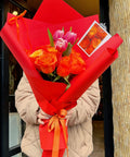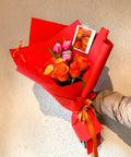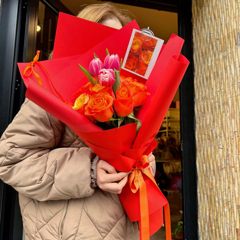 Özenle seçilmiş turuncu güller ve pembe laleler, modern kırmızı ambalaj ve Amavi’nin imza bağlama stiliyle tamamlanarak dinamik ve dikkat çekici bir görünüm sunar. Günlük mutluluklar kadar özel anlar için de ideal bir hediye alternatifidir.